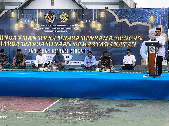 Untuk pertama kalinya dibulan Ramadhan para warga binaan, keluarga dan petugas duduk bersama menyantap hidangan berbuka puasa yang sudah disiapkan. Ratusan keluarga warga binaan pemasyarakatan (WBP) terlihat mulai berbondong-bondong datang sejak sore ke Rutan Kelas I Medan. Kebahagiaan terpancar dari wajah keluarga WBP. Suasana hangat terlihat saat para WBP berkumpul di lapangan Rutan dalam acara buka puasa bersama.